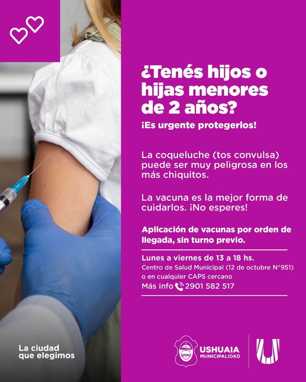 La Municipalidad de Ushuaia a través de la Secretaría de Políticas Sociales, Sanitarias y Derechos Humanos, lleva adelante una campaña especial de vacunación contra la coqueluche (tos convulsa), con el objetivo de prevenir contagios y proteger especialmente a los bebés y niños pequeños.